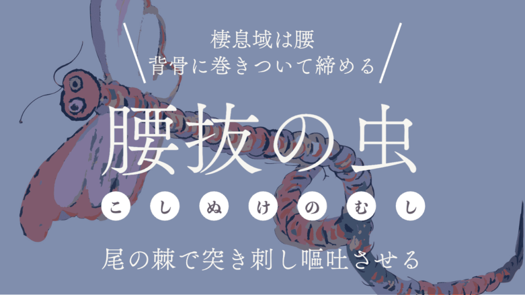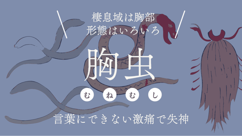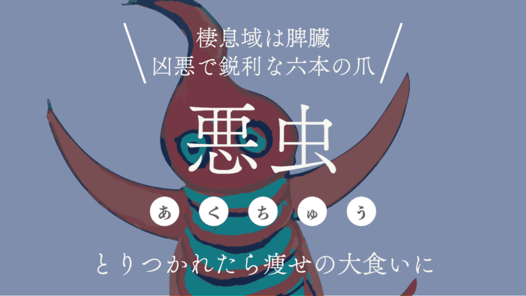 ヘビやトカゲなど爬虫類に似た形をした虫です。脾臓や肝臓など内臓に棲みます。移動が速くて逃げられないとされました。悩みやストレスを引き起こしたり、気絶や頓死を招いたりする恐ろしい虫です。