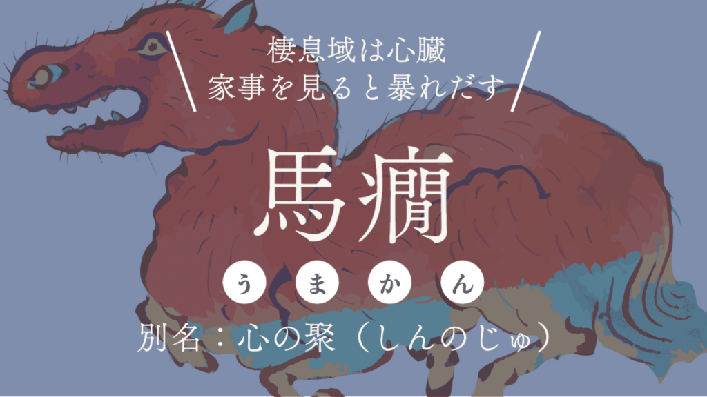 心臓に棲んでいる、馬のような見た目でとても足の速い虫です。強い光や火事などを見ると暴れだします。現在でいう、てんかん症状の原因の1つと考えられていました。別名「心の聚(しんのじゅ)」とも言います。激しい鍼治療は施してはいけません。