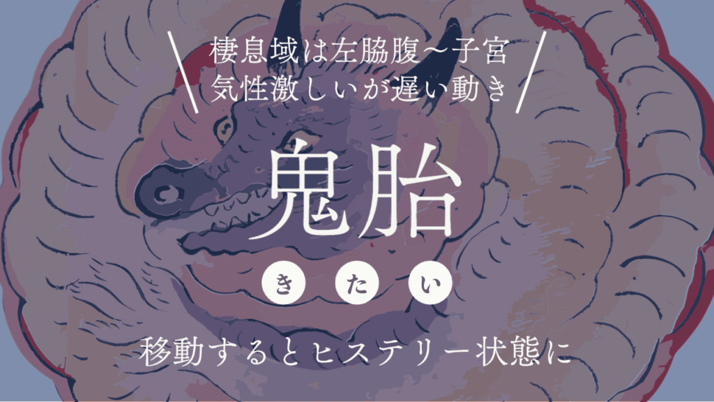 左の脇から生まれる、イライラの虫。大きめの盃くらいの血の塊がだんだん大きくなり、やがて中心部に牛のような顔ができます。気性は激しいのに脇腹から子宮に向かって非常にゆっくりと移動します。その間じゅう、取り憑かれた人間はイライラしやすい状態、ヒステリーになります。鍼を刺して逆ギレされると逆効果になるので施さない方がいい時もあります。