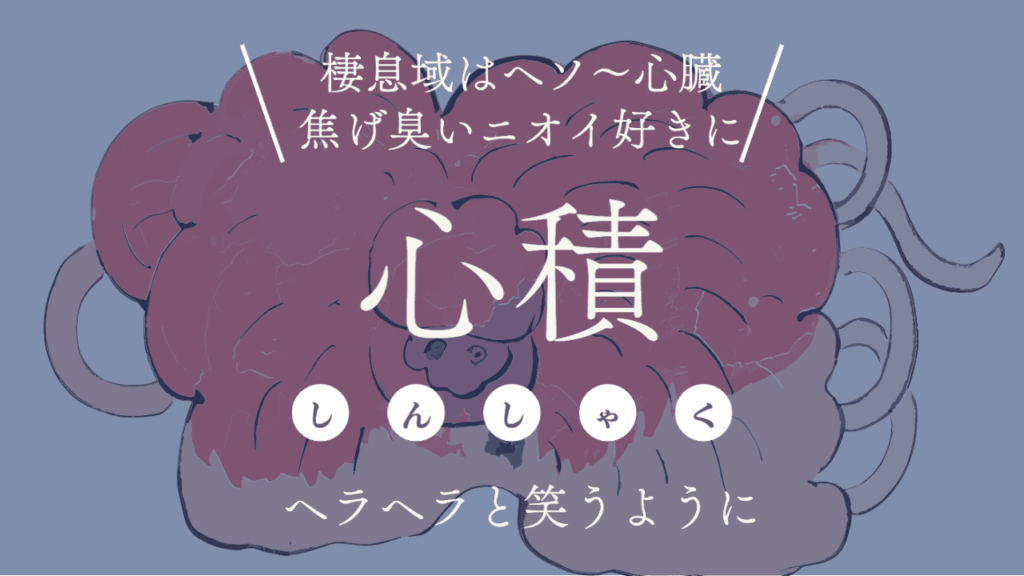 へそから心臓に棲んでいる、人の顔に似た虫。血液を吸って大きくなります。心臓が圧迫されて動悸や胸痛などを引き起こします。取り憑かれると焦げ臭いニオイと苦い味が好きになります。精神力を弱め、いつもヘラヘラ笑うようになります。勢いよく成虫になると治りにくくなります。別名「伏梁(ぶくりょう)」。