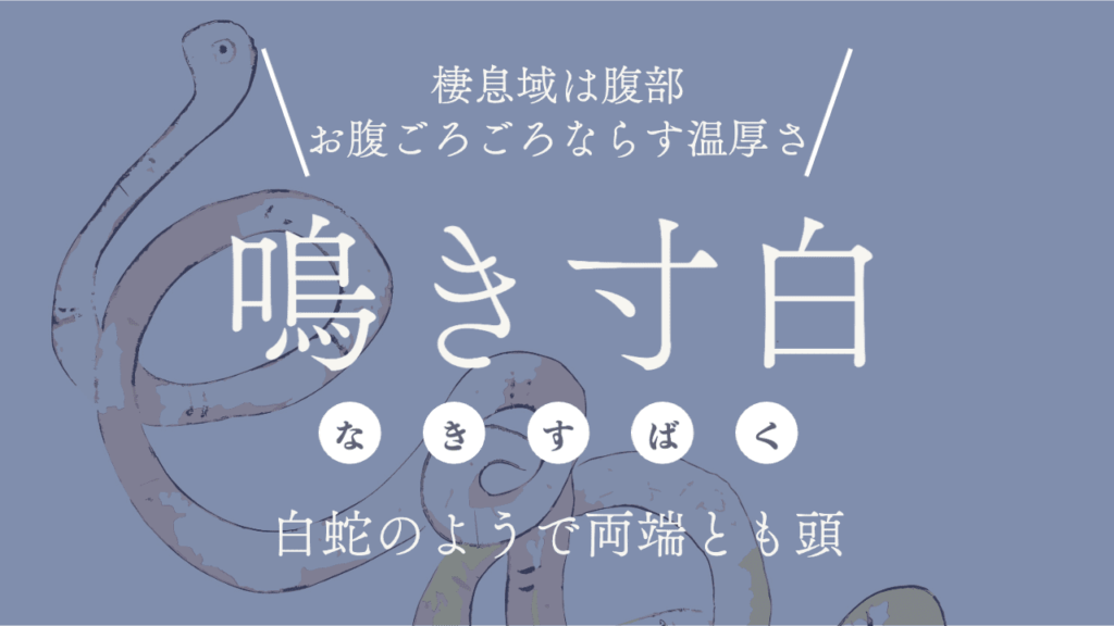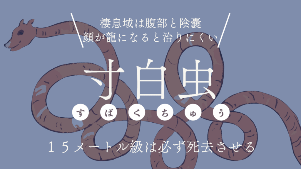 腹部に棲んでいる、トカゲのような虫です。激しい腹痛や下痢を引き起こします。別名「腹虫(はらむし)」とも言います。1年に1,2度、あるいは1ヶ月に一度、腹部と陰嚢に激痛を引き起こします。長さが15メートルを超えた寸白虫にとりつかれると必ず死んでしまいます。治療は鍼術が効果的です。