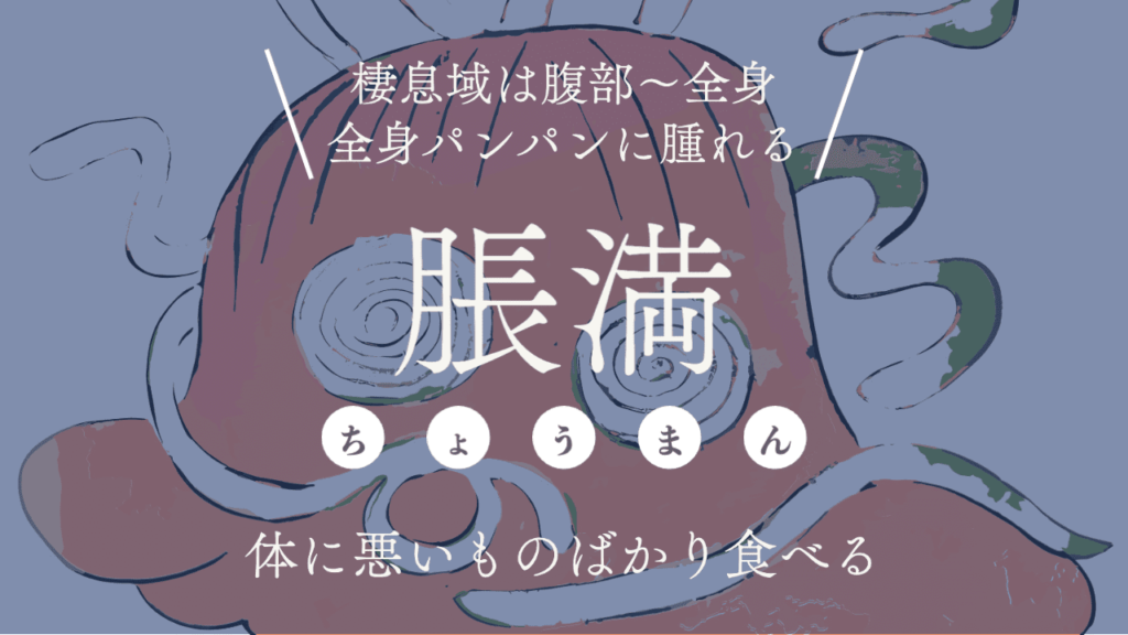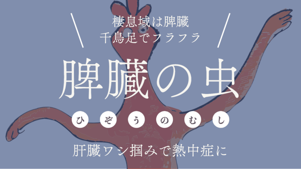 脾臓に棲んで、肝臓や筋肉に悪さをする虫です。現代でも毎年夏に問題になっている、熱中症によく似た症状を引き起こします。熱で真っ赤になり、頭を強く打ったようなめまいが起き、体が火照ります。漢方薬のモッコウとダイオウで消えるといいますが、この脾臓の虫くん自身も目を回してフラフラしています……
