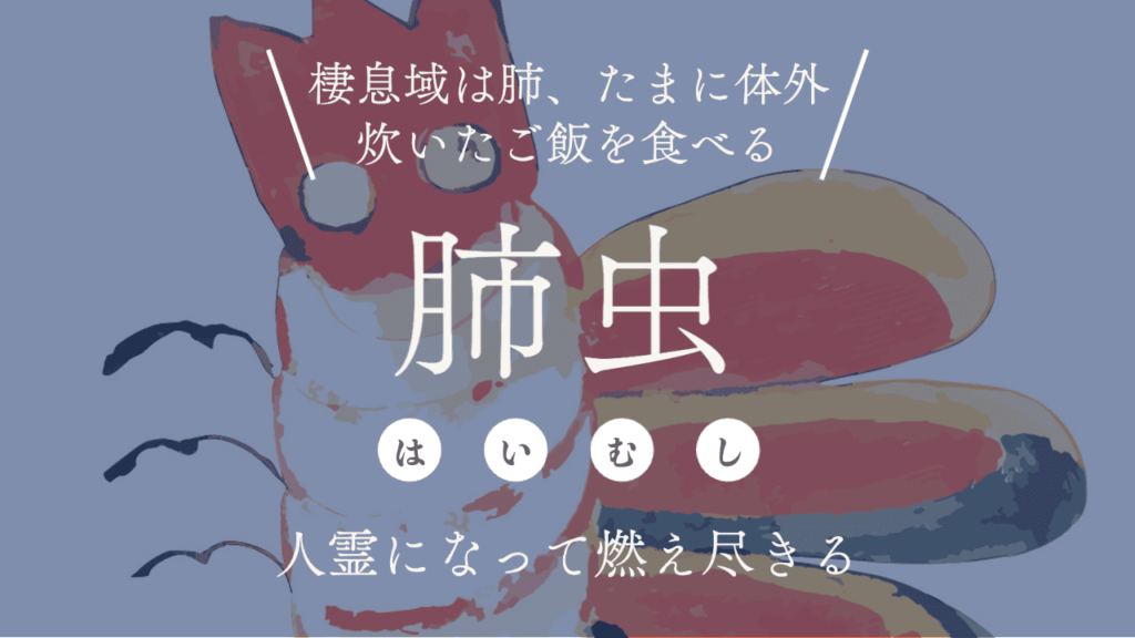 昆虫やトンボなど虫に似た形をした虫です。肺や腰など様々な場所に棲みます。汗や嘔吐を引き起こしたり、鳴き声を出したりして不快感を与えます。
