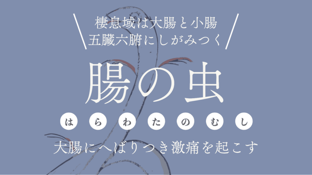 腸に棲んでいる、ヘビのような虫です。あちこちに生えた足で五臓六腑にしがみつく凶悪な虫。食欲不振や便秘、下痢などを引き起こします。別名「腸虫(ちょうむし)」とも言います。引起草をお茶のようにして服用すると効果的。