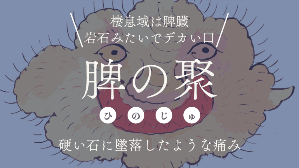 肝臓に棲んでいる、女性の乳(顔が乳頭、体が乳房)のような形です。肝臓が腫れて圧迫感や痛みを引き起こします。別名「肥気(ひき)」とも言います。怒りで顔が青ざめてすぐに人を怒鳴りつけます。油臭いものを嫌がります。左脇腹の本体に鍼を刺し、背骨にも刺す鍼術を施します。
