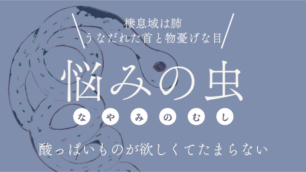 肺に棲み、落ち込ませる虫です。些細なことにも悲しんで、世の中が嫌になってしまうやっかいな代物です。しかし物憂げな表情を見ていると、どうにもこの虫の好きな酸っぱいものをあげて慰めたくなってしまいます。レモン酎ハイなんかで今夜イッパイどーですか?